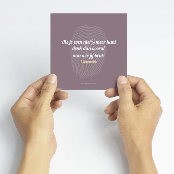 Een set van vier kaarten met mooie uitspraken. Stuur deze kaarten naar die persoon die het nét even nodig heeft dit te horen! De kaarten zijn 13,5 bij 13,5 cm en komen met een envelop.