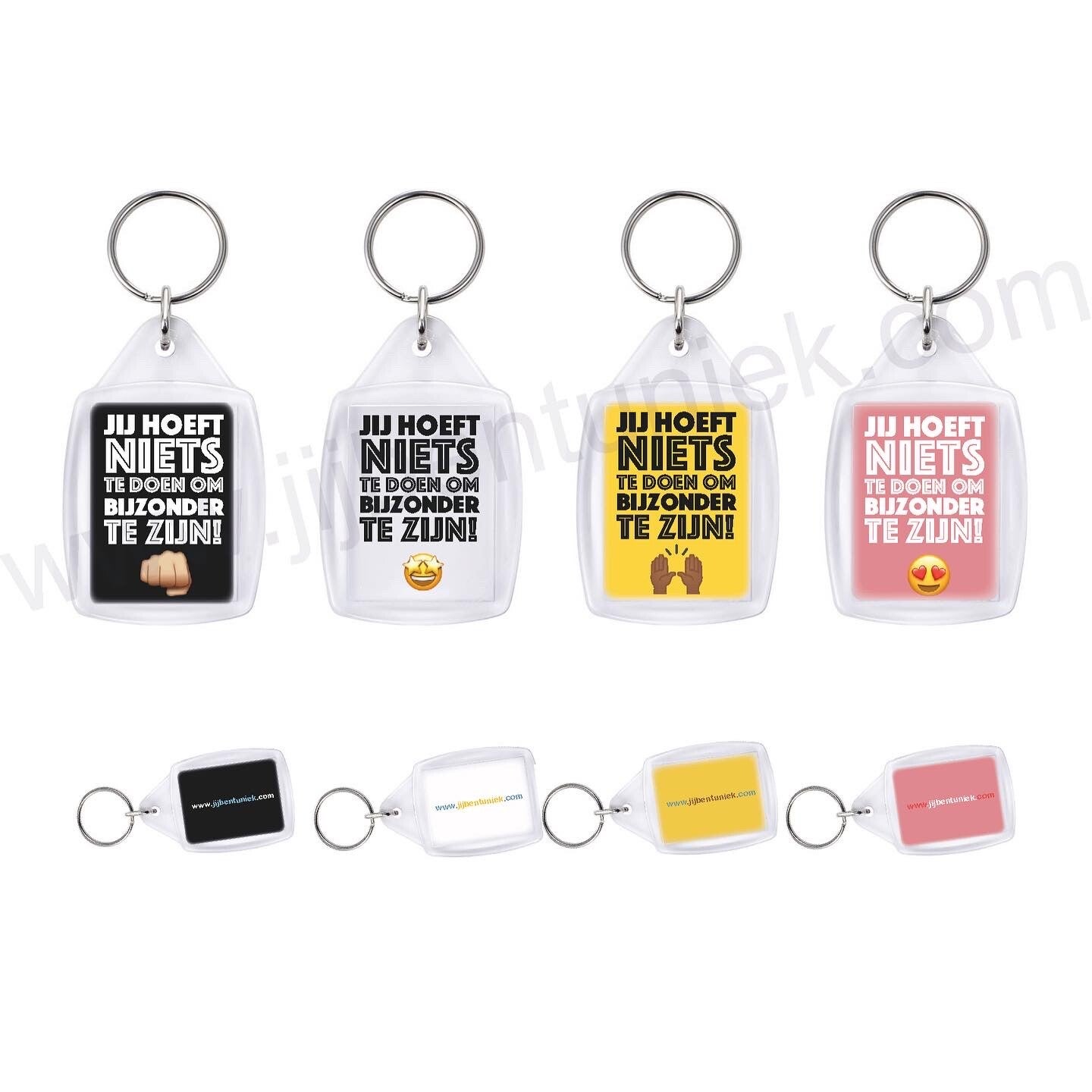 Deze sleutelhangers hebben allen de tekst 'Je hoeft niets te doen om bijzonder te zijn!'. Afmetingen van de sleutelhanger zijn 3,5 bij 4,5 cm.