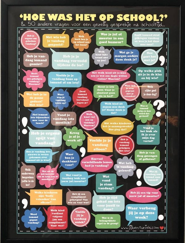 De poster '50 vragen over school' komt prachtig uit in deze zwarte schilderijlijst. Een echte eye-catcher die leuke gesprekken aan de keukentafel oplevert!